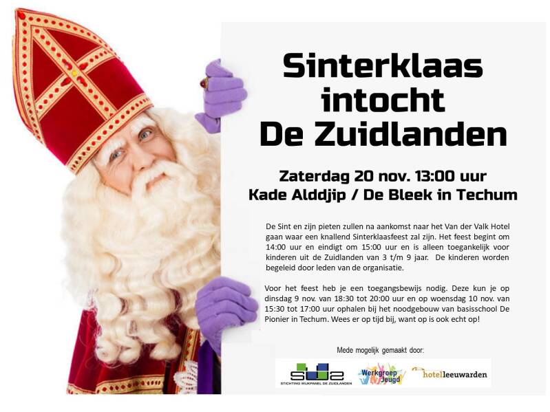 Deze week valt deze flyer op ieder adres in De Zuidlanden in de bus. Kom ook naar de aankomst van de goedheiligman. De toegang is vrij. Wil je kind naar het feest dat aansluitend in het Van der Valk hotel wordt gehouden? Haal dan intijds een toegangsbewijs!